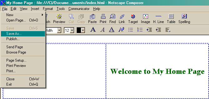 As with most standard Windows programs, the 'Save As' option appears under the 'File' dropdown menu inside Netscape Composer. To continue this tutorial click 'Save As' in the screenshot below.